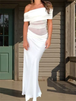 Women Summer Long Dress Solid Color Boat Neck Off Shoulder Bodycon Fashion Dress for Party Clubwear