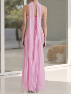 Women Party Long Dress Solid Color Tube Dress Summer Fashion Backless Casual Strapless Pleated Dress with Choker Scarf