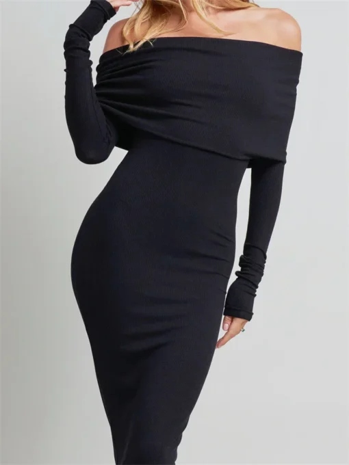 Women’s Long Fitted Evening Dress Black Long Sleeve Off Shoulder Strapless Party Dress