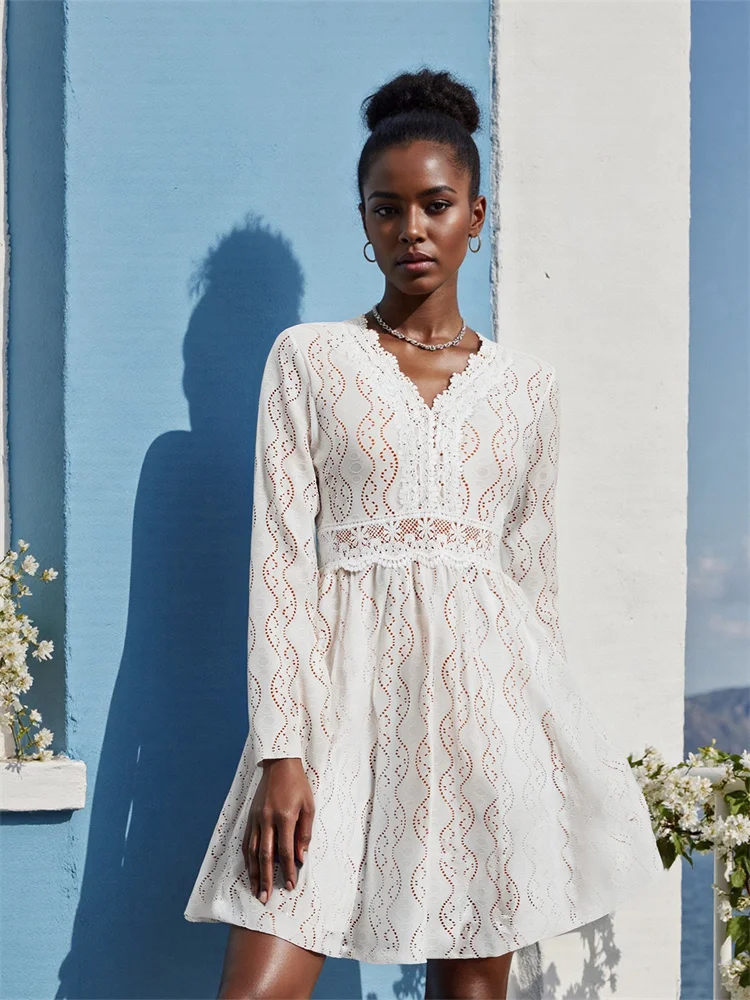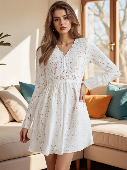 Women Autumn Knee Length Dress Long Sleeve Deep V Neck Lace Patchwork Eyelet Dress